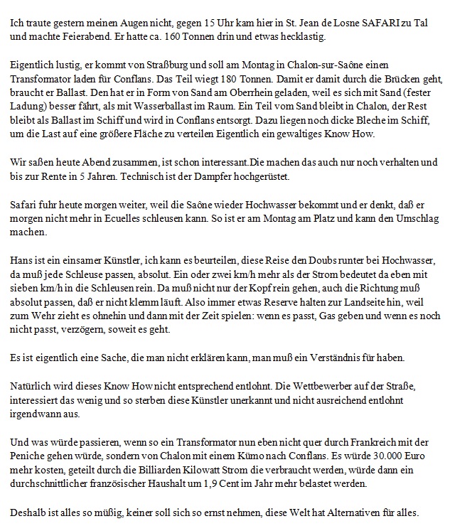 "Hier je ne croyais pas mes yeux. Le SAFARI descendait ici à St.Jean de Losne vers 15h et s'amarrait pour la nuit. Chargé d'env. 160t et un peu à cul.