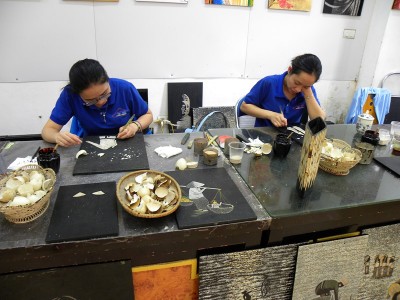 Nous avons visité un atelier de bois laqué, impressionnant le travail de ces Artistes.La responsable nous a dit : ici au Vietnam les fonctionnaires (tous corrompus du premier ministre au chien jaune) travaillent 5 jours par semaine et les autres personnes 6 ou 7 jours par semaine et 10 h par jour + 2 x 1,5 h pour les trajets.