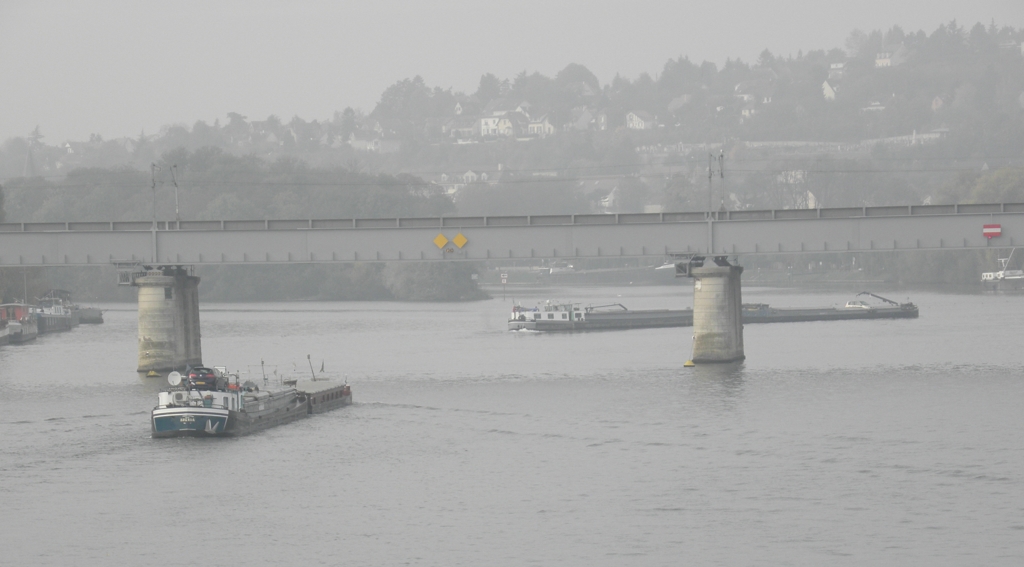 Non je déconne, en fait, j'avais envie de mettre cette photo qui contient deux doublettes sous la brume Conflannaise qui passent ou viennent de passer sous le pont SNCF pour prendre l'Oise...