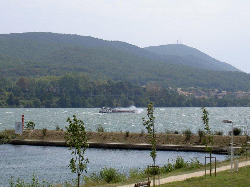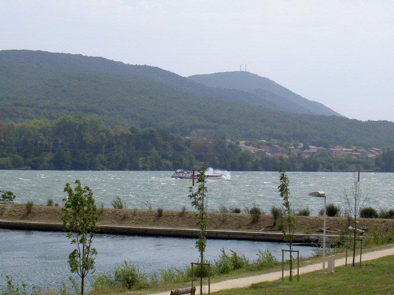Fort vent du sud 2 38m en descente ce jour au large de Cruas.