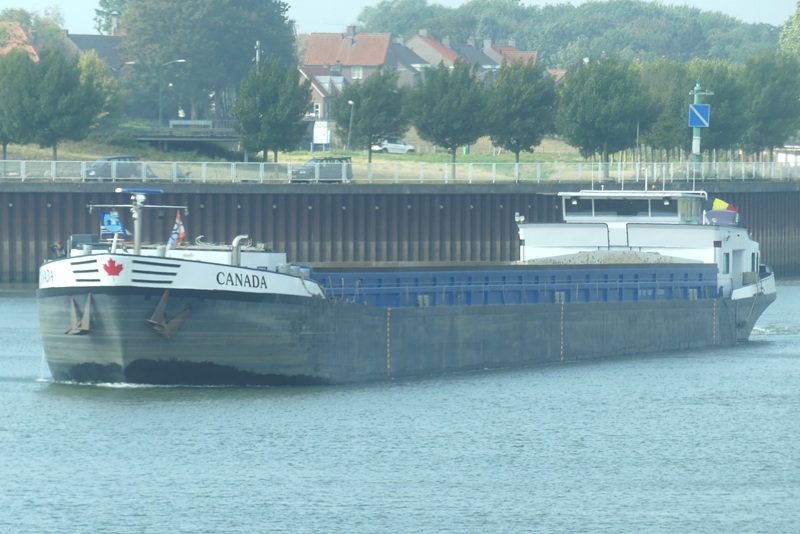 Canada , 105,00 x 10,54 x 3,19 , 2360 ton , Bouwjaar 1987 , Werf De Hoop in Lobith ( Nederland ) en Breko in Papendrecht ( Nederland ) , 1270 pk Stork , ex Lisieux , ex Scheldestad , ex Santorini , ex Canada , eigenaar Caso Shipping in Stabroek , ENI 06003909