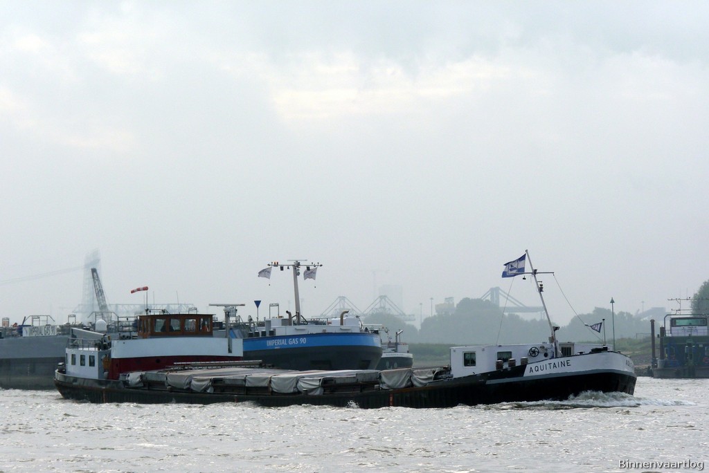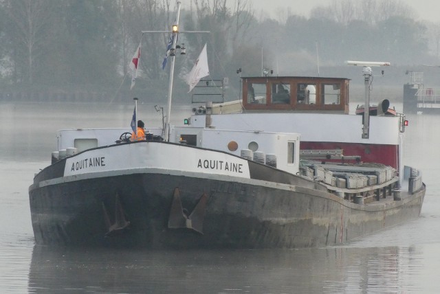 Aquitaine , 68,97 x 9,05 x 2,52 , 958 ton , Bouwjaar 1958 , Werf De Groot & v.Vliet in Slikkerveer ( Nederland ) , 1100 pk Wärtsilä , ex Columbus , ex Montreux , eigenaar J.M.Teunisse – Tabak in de Meern , ENI 02319450