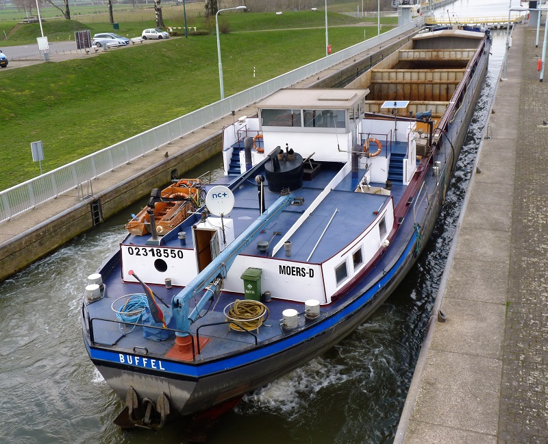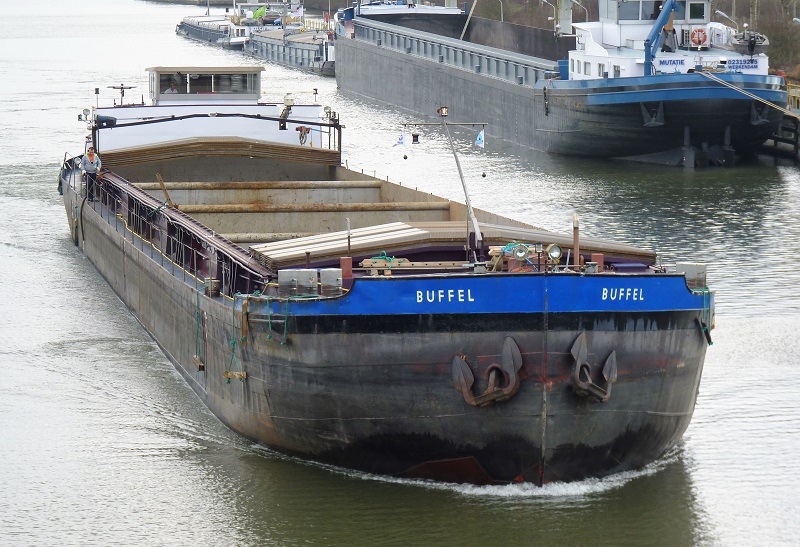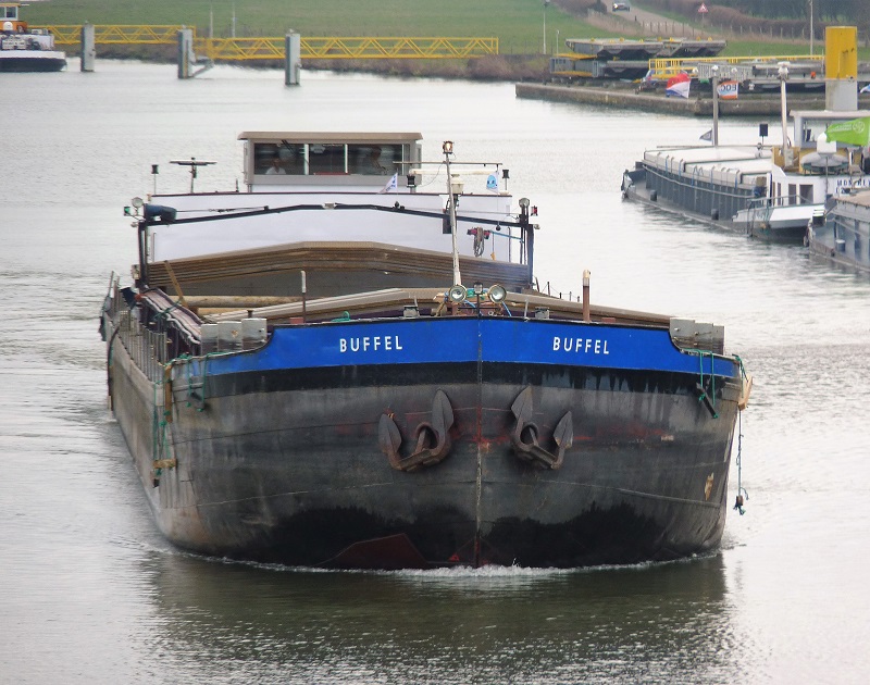 Büffel , 79,98 x 9,47 x 2,51 , 1209 ton , Bouwjaar 1940 , Werf De Groot & van Vliet in Slikkerveer ( Nederland ) , 2 x 425 pk Deutz en 320 pk DAF boegschroef , ex 3 x Sonvico , ex 3 x Buffel , eigenaar Handelsgemeinschaft in Moers , ENI 02318550