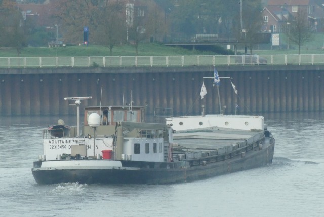 Aquitaine , 68,97 x 9,05 x 2,52 , 958 ton , Bouwjaar 1958 , Werf De Groot & v.Vliet in Slikkerveer ( Nederland ) , 1100 pk Wärtsilä , ex Columbus , ex Montreux , eigenaar J.M.Teunisse – Tabak in de Meern , ENI 02319450