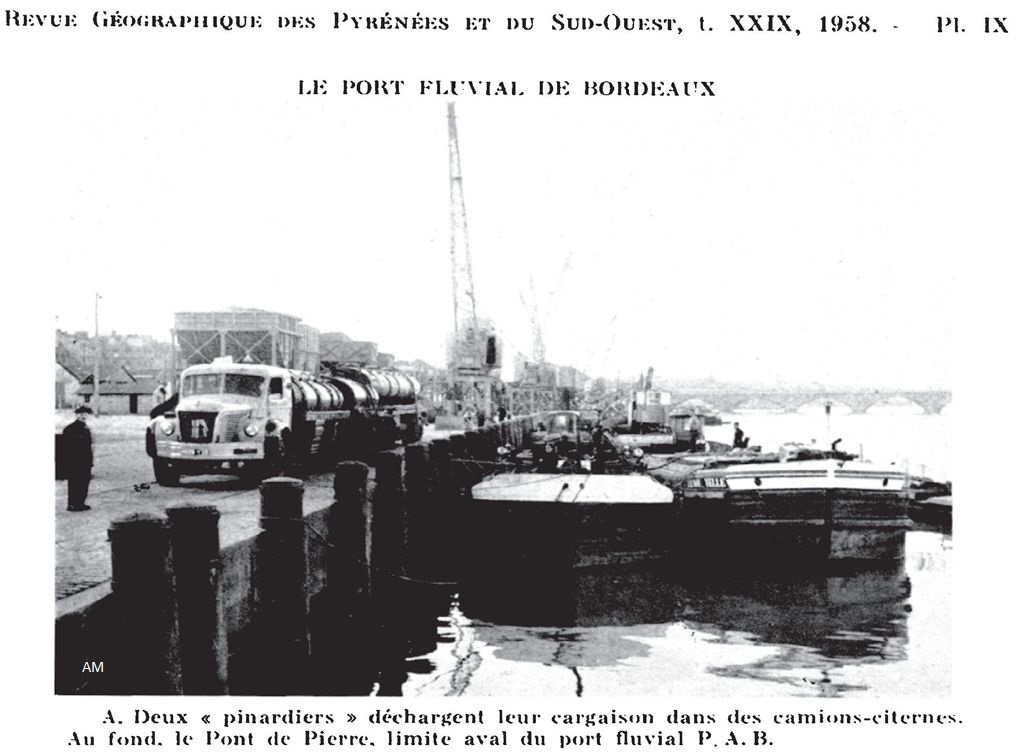 Sur cette photo du quai Sainte Croix à Bordeaux on peut voir 2 Fluviales en train de débarquer du vin.
