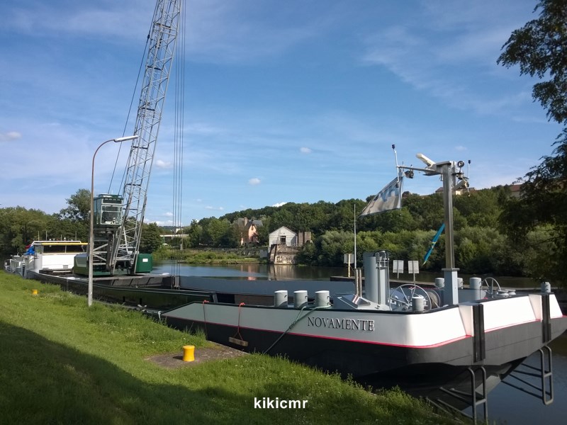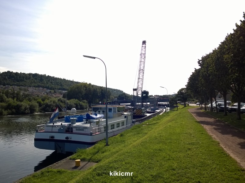 Un bateau avec une grue amarré à l'aval de l'écluse de Pompey (54) :