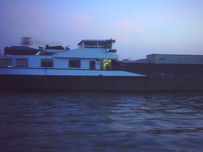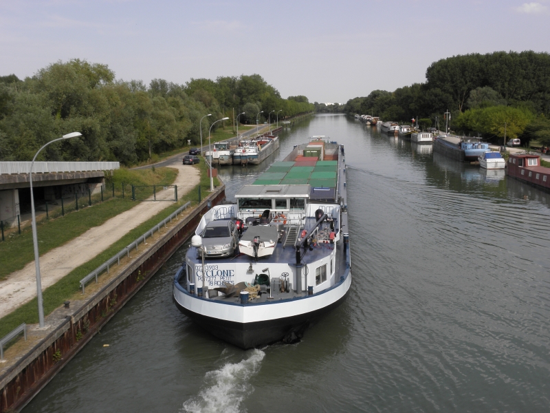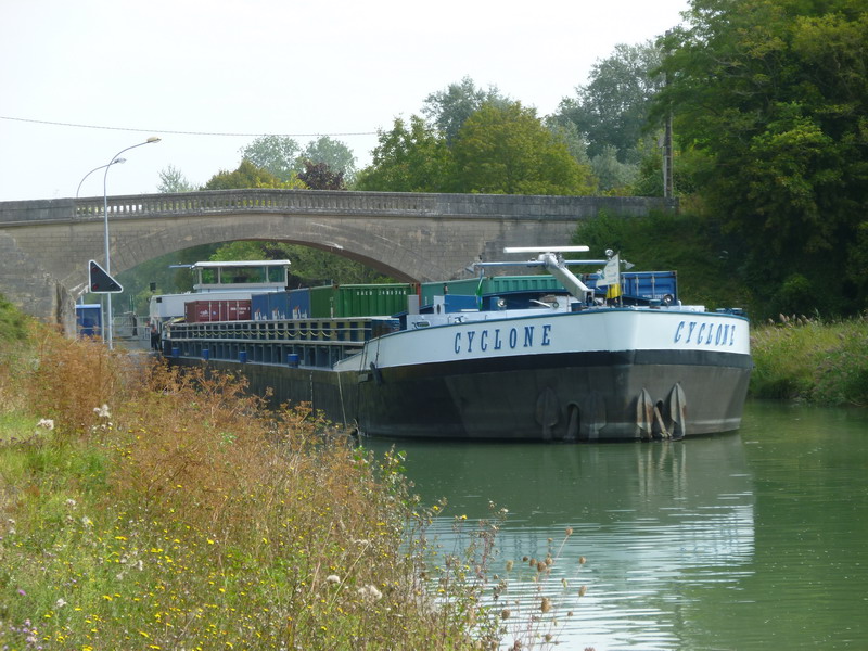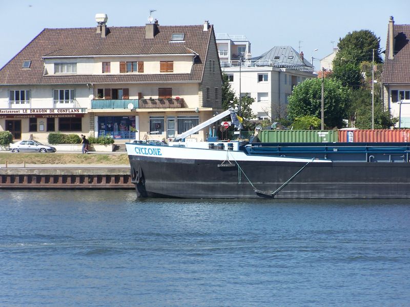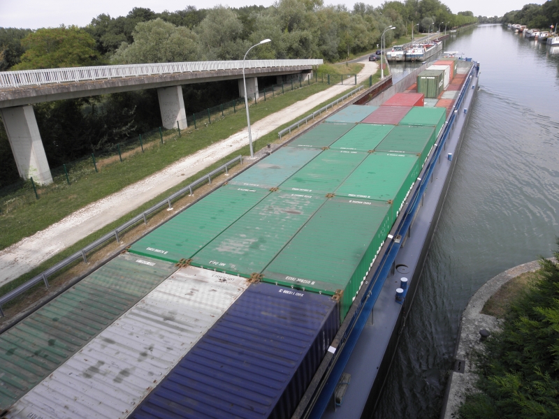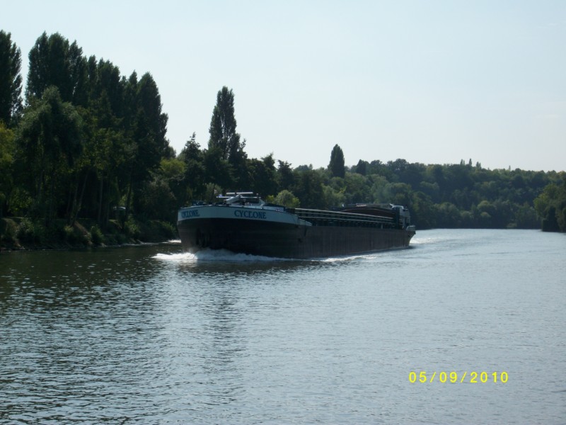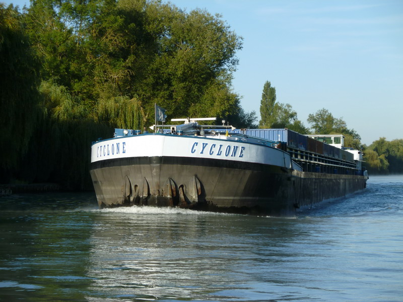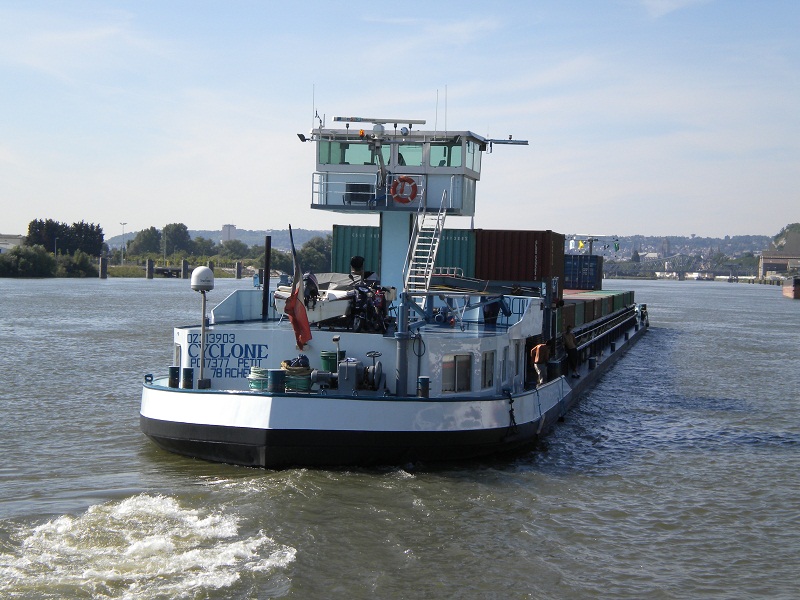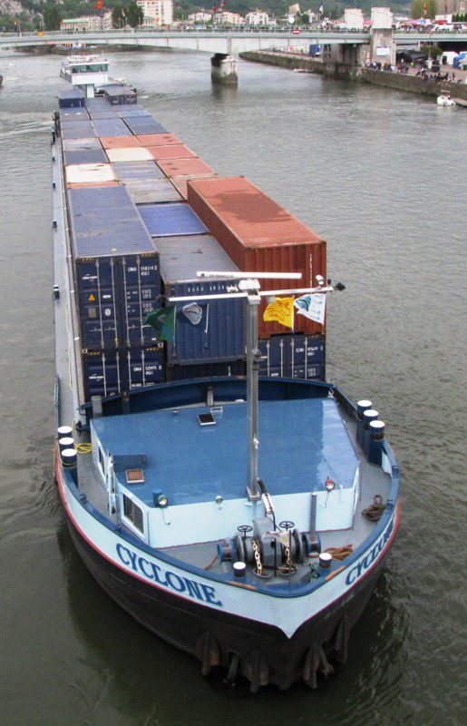 Le CYCLONE avalant sur la Seine juste au dessus de Rouen avec 2 hauteurs de conteneurs presque partout et 3 hauteurs al'avant et a l'arriere sur 3 largeurs.