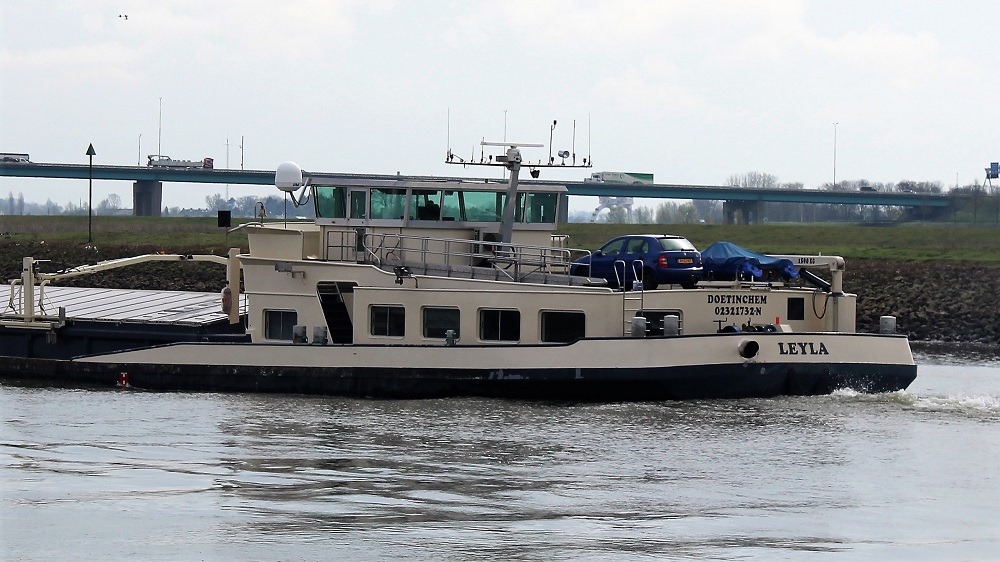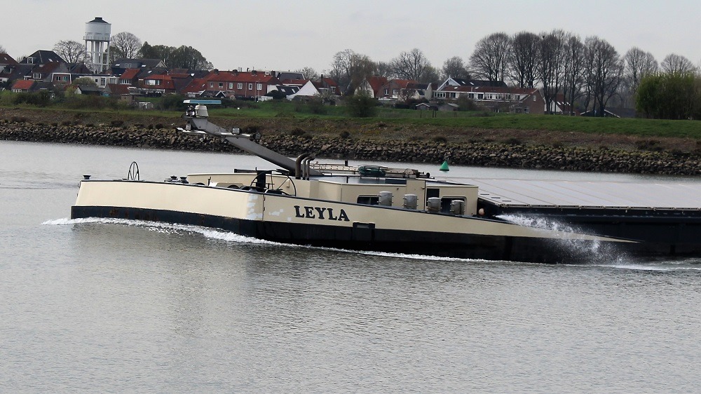 Leyla , 109,86 x 11,40 x 3,28 , 2755 ton , Bouwjaar 1994 , Werf Santierul Naval Orsova SA in Orsova ( Roemenië ) en Dolderman in Dordrecht ( Nederland ) , 1633 pk Caterpillar en 450 pk Caterpillar – Verhaar Omega-Jet boegschroef , ex Navitas , eigenaar Vof.