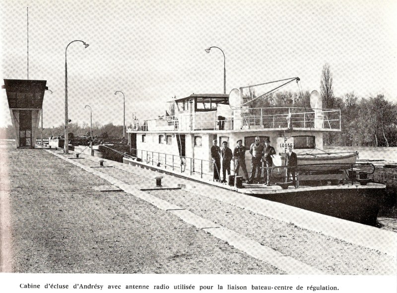 Vu dans "Voies Navigables de France", collection Regards sur la France, n°35, mars 1967 : le pousseur n'est pas le sujet principal, il sert juste de décor pour montrer l'antenne qui se trouve sur le poste de commande de l'écluse d'Andrésy... Mais peut-être certains se reconnaîtront-ils sur la photo, ou reconnaîtront les personnes photographiées...