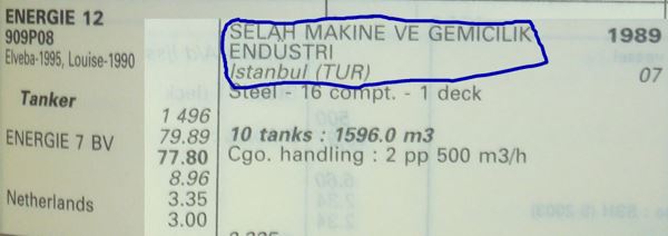 Sur un document officiel de 2006, j'ai comme chantier : Selah Makine ve Gemicilik Endustri, à Istanbul, en Turquie... (toutes les autres infos correspondent)
