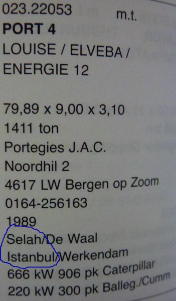 Port 4 ,79,89 x 9,00 x 3,10 , 1496 ton , Bouwjaar 1989 , Werf Selawerft in Tuzla ( Bosnië-Herzegovina ) en de Waal in Werkendam ( Nederland ) , 906 pk Caterpillar , ex Louise , ex Elveba , ex 2 x Energie , eigenaar J.A.C. Portegies in Bergen op Zoom , ENI 02322053