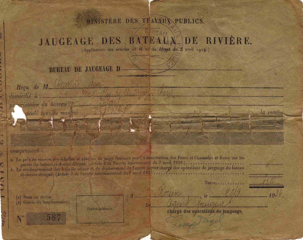 Et donc.. nous avons aussi le certificat de jaugeage en date du 20 Septembre 1934....