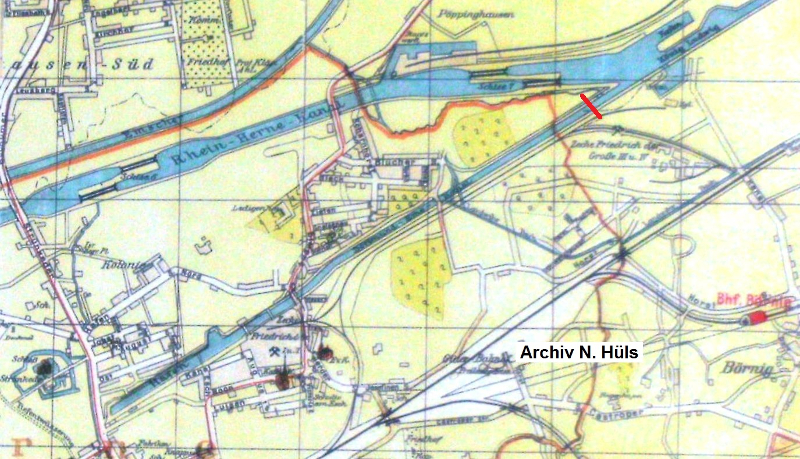 J`ajoute une deuxième photo comme comparaison. Cette partie du canal, une branche de 2,8 kilomètres jusqu`à Herne, n`éxiste plus (voyez la vieille carte. Aujourd`hui, l`ancien port de Herne se trouve au nord du croisement de la Kanalstraße et la Eschstraße). Dans les années trente, on avait abandonné cette petite branche du canal parce qu`il y avait des abaissements causés par l`exploitation des mines. Aujourd`hui, il y a l`autoroute No. 42 au lieu d`ancien canal. - On avait beaucoup de problèmes avec des abaissements sur le canal du Rhin à Herne et les doubles écluses ne sont pas construits parallèlement pour cette raison. On peut voir cela sur la carte aussi.