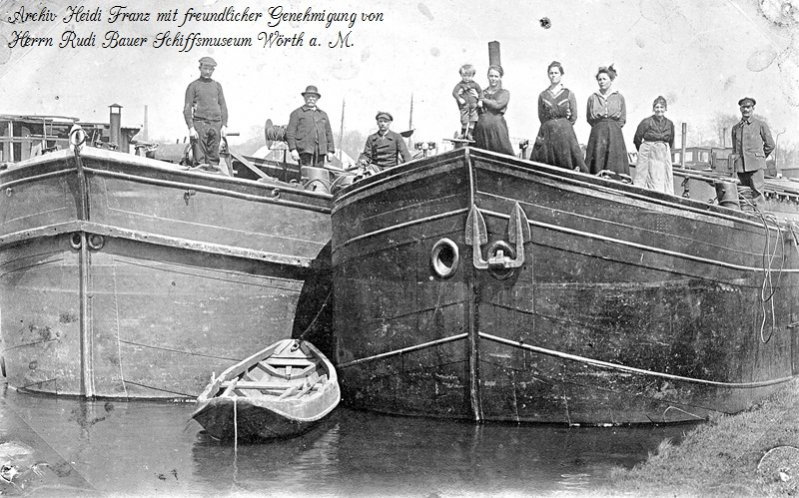J`ai deux photos publié par la musée pour la navigation sur le Main à Wörth sur le Main. Le texte veut dire que ce soient des campenois sur la Sarre environ 1930, mais ce n`est pas possible parce que sur la Sarre il n`y avaient que des écluses à 5,20 m. Pour cette raison, je ne pense pas à la Sarre, mais peut-être à la Meuse ou il y avaient des campenois et des 38 mètres.