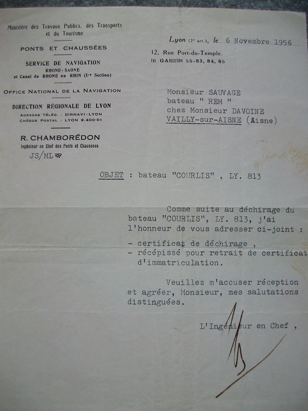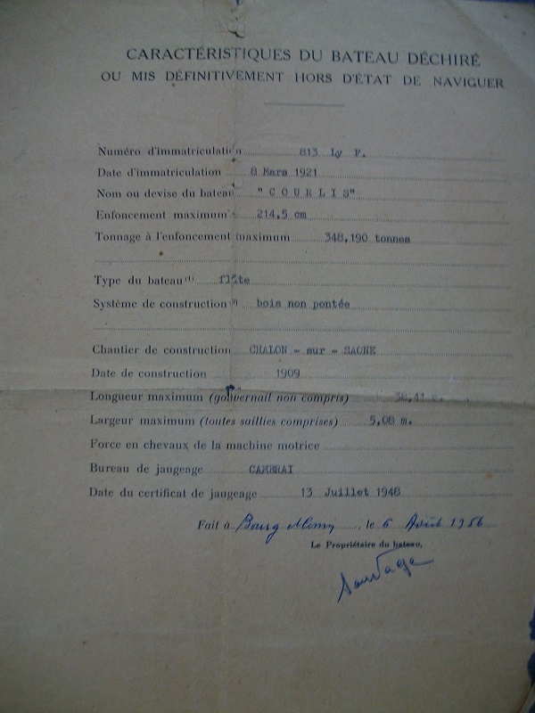 Je mets ici pour le COURLIS, le papier concernant son déchirage ( une bonne âme déplacera si cela doit être fait ) . Je ne trouve pas de photos du bateau, seulement du déchirage ... bizarre car je suis sûre d'en posséder !