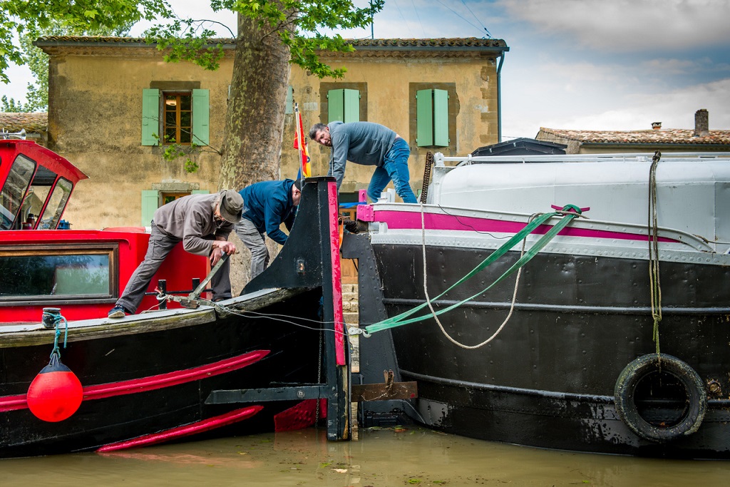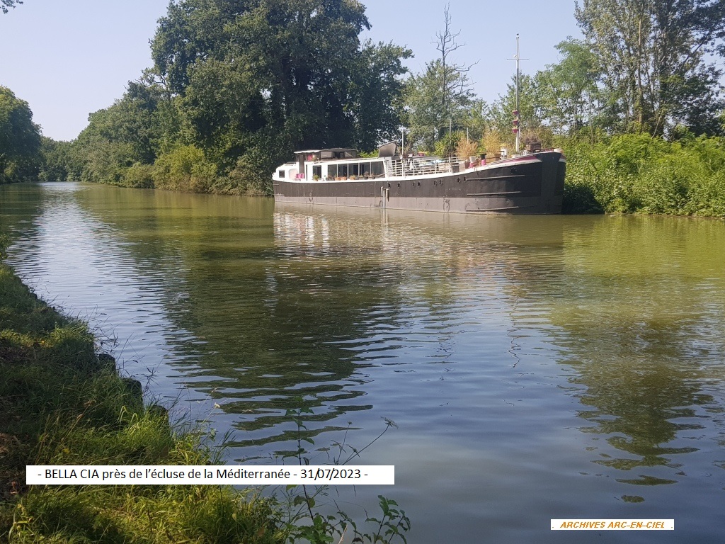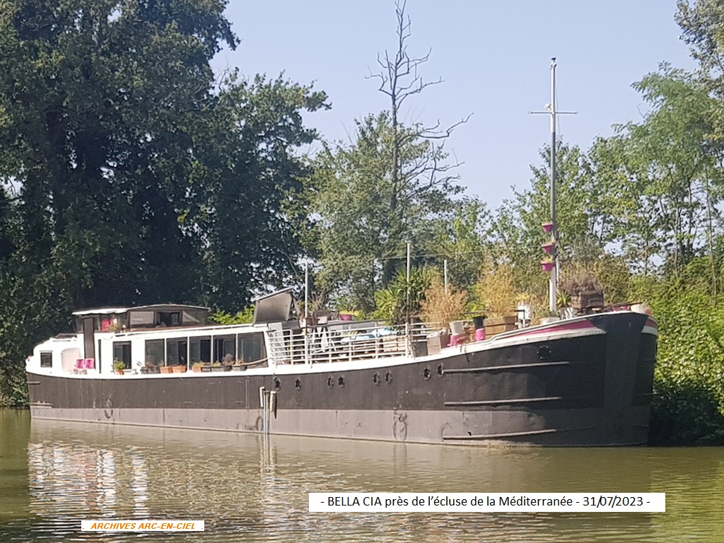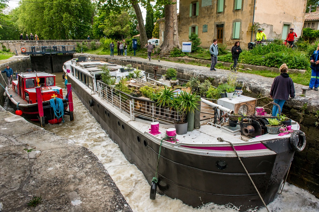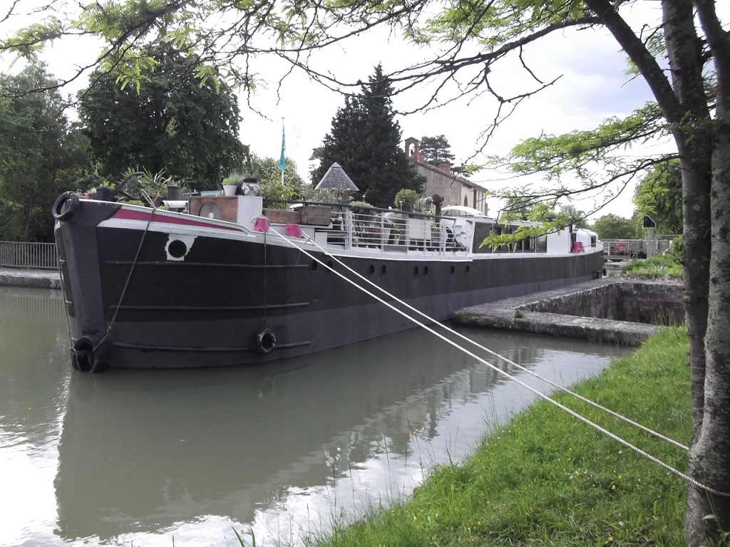 Ce bateau logement est à ce jour amarré dans le bief de partage, juste au-dessus de l’écluse de la Méditerranée.