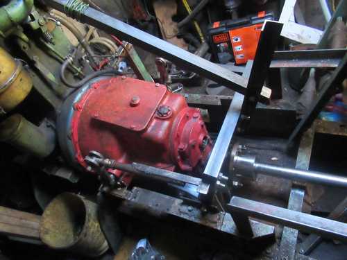Voila le bestiau en place. L'axe en sortie n'est là que pour voir si l'alignement avec l'arbre d'hélice est bon. Manque de bol, il y a plus d'un cm de décalage en hauteur, donc pas question, sur aussi peu de longueur (50 cm) de mettre deux accouplements souples, ce sera un cardan...