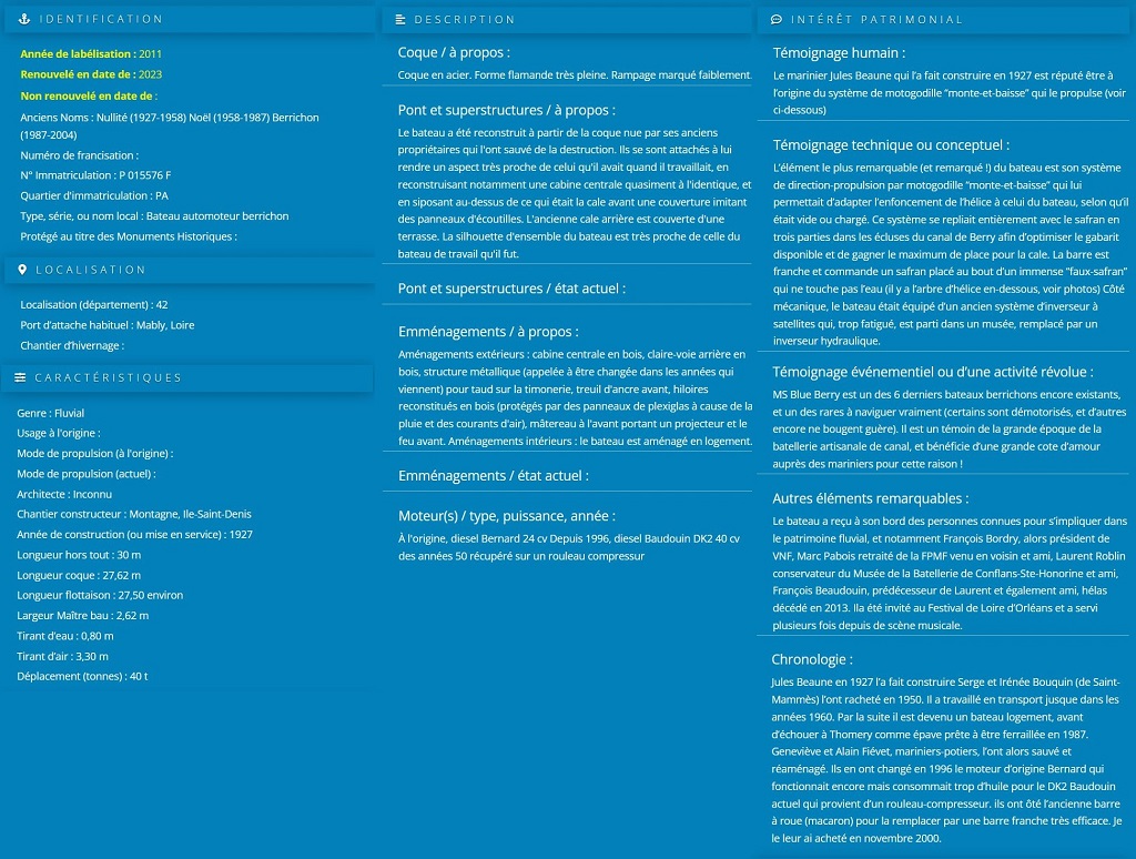 Le MS BLUE BERRY - P15576F - a été labellisé PATRIMOINE MARITIME ET FLUVIAL en 2011, renouvelé en 2023.