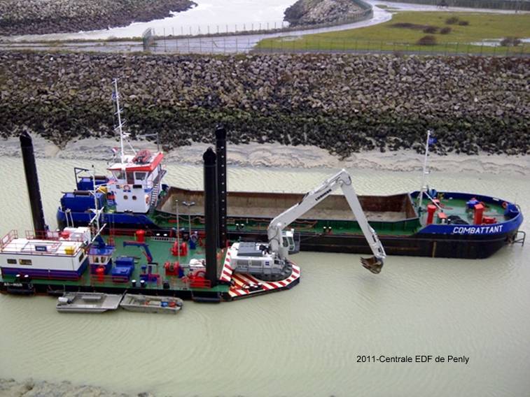 Cette pelle a été embarquée à la réception du ponton et remplacée ensuite par des Liebherr 974 la dernière en date étant une 974 sur tourelle.