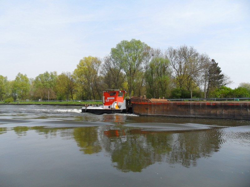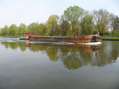 Devant le pousseur, il y a une grue sur un ponton flottant... ponton flottant formé de plusieurs caissons... caissons avec devises et matricules ! Si, si !