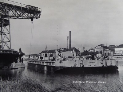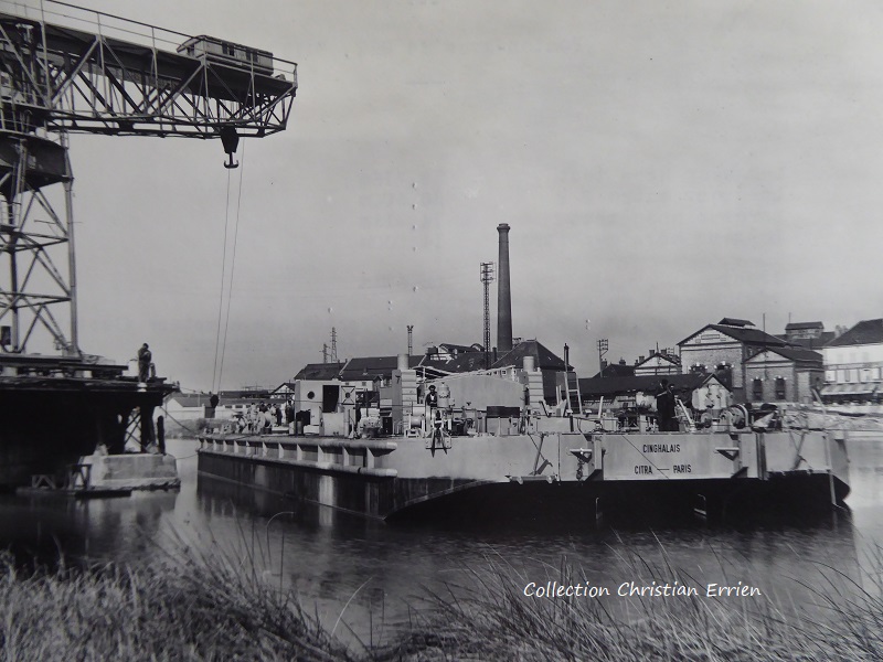 Voici une photo originale montrant un ponton nommé CINGHALAIS à sa sortie du chantier Schneider à Chalon sur Saône dans les années 50.