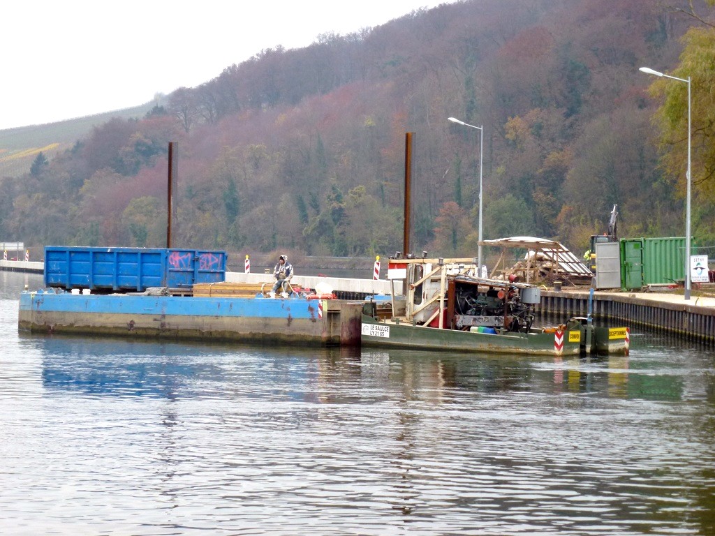 Ah ! Souvenir d'un beau chantier ! Rénovation de l'estacade amont de l'écluse d'Apach ! Avec un bateau (appartenant aux Ets Roche de Brazey en Morvan