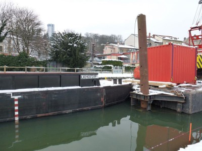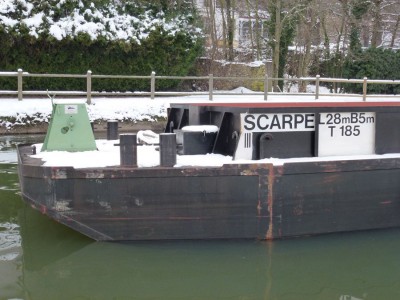 Ce qui est bien, c'est que NAVIGATION PORT INTERMODALITE (NPI) vient de consacrer un article à cette barge (et ses soeurs) dans son numéro de novembre/décembre 2012 ! J'écris "ses soeurs", parce qu'en effet, elles sont trois, SCARPE I, SCARPE II et celle-ci, SCARPE III, a avoir été construites par éléments de 6 mètres par les Établissements Daussy de Sin-le-Noble, et assemblées par le chantier Despinoy à Courchelettes. Conçues par le bureau d'études Technifrance pour répondre aux besoins de Bouygues TP régions France, elles portent 210 tonnes à 2 mètres d'enfoncement ; la construction a été suivie par le bureau de contrôle Benoît Castel.