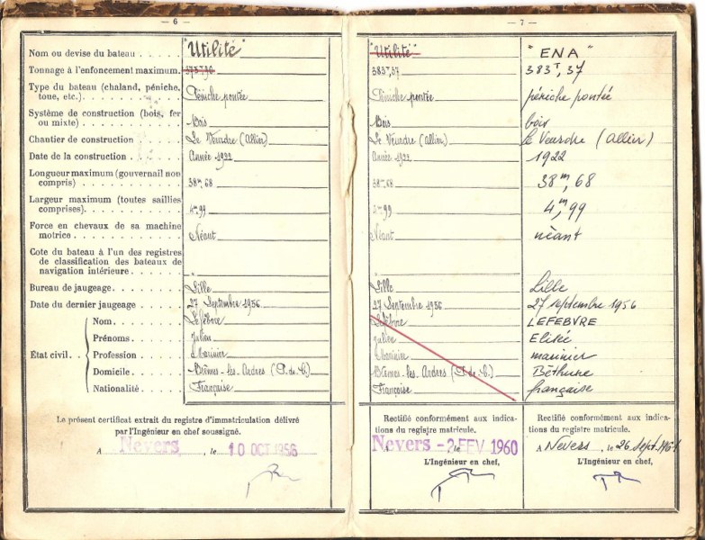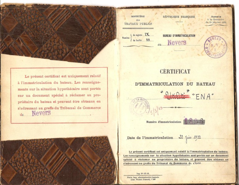 ceci sont les premieres pages du certificat d immatriculation de la peniche Ena cette peniche de la jeunesse a Eliane mon epouse qui a passer sa vie de jeune fille