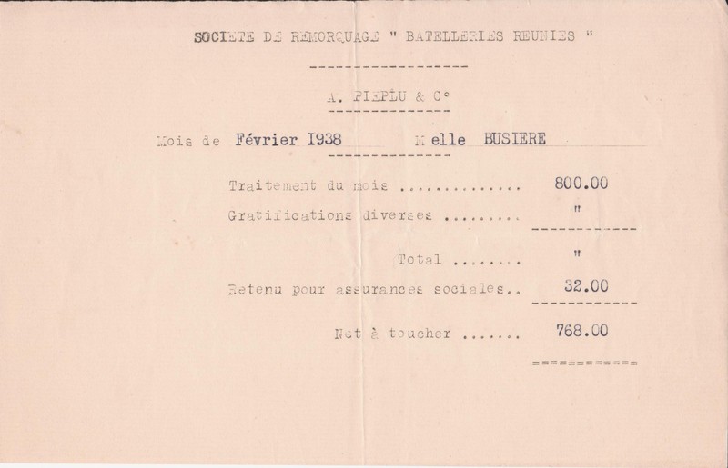 C'était hier !! Voici un bulletin de salaire de Mlle Busière de février 1938. Je viens de retrouver les feuilles de salaire pour la période allant de janvier 1938 à mai 1940. Je ne connaissais pas cette Société de Remorquage "Batelleries Réunies". Archives perso de ma belle-famille. Baron