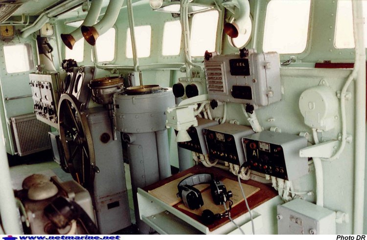 Voici une photo de la passerelle de navigation du BDC Dives, sur lequel j'ai effectué mon service militaire en 84 / 85. On peut y voir, au-dessus de la barre à roue et du poste de l'officier de quart, les tubes porte-voix. De mémoire, l'un communiquait avec le PC machines, un autre avec la passerelle extérieure (utilisée par le Pacha lors des manoeuvres portuaires), et le troisième avec le local barres.