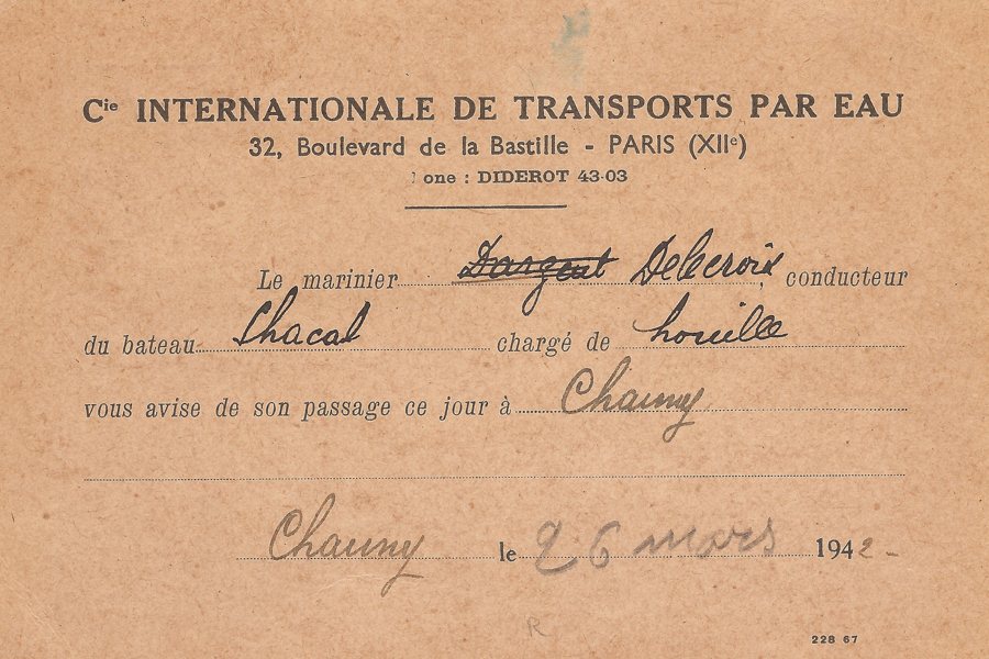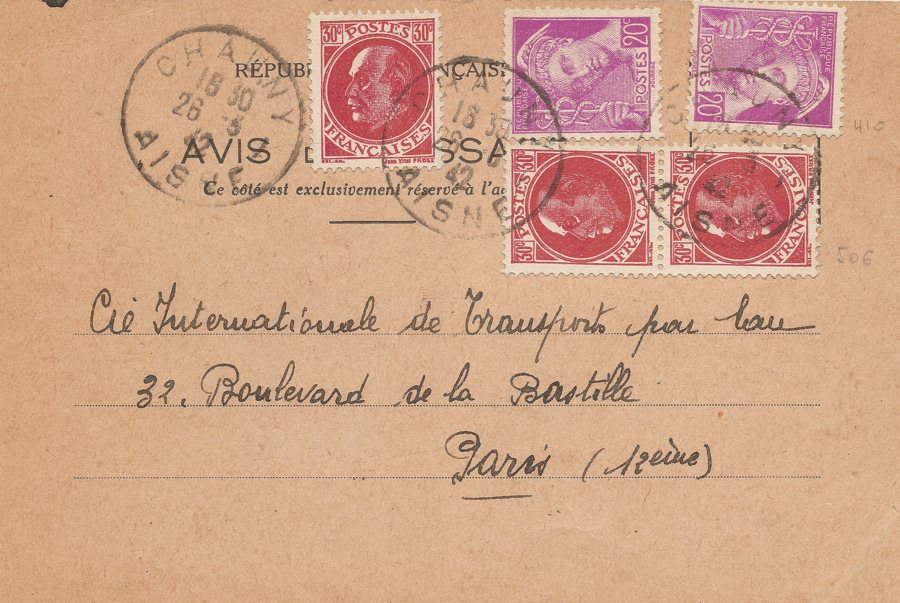 - sur une face, on voit l'adresse manuscrite de la Compagnie Internationale de Transports par Eau, 32 boulevard de la Bastille, Paris 12ème, et les timbres, 3 de 30 centimes, rouges, à l'effigie de Pétain et 2 de 20 centimes, teinte lilas, représentant le dieu Mercure, ainsi que deux timbres à date de Chauny, Aisne, du 26 mars 1942 à 16h30 :