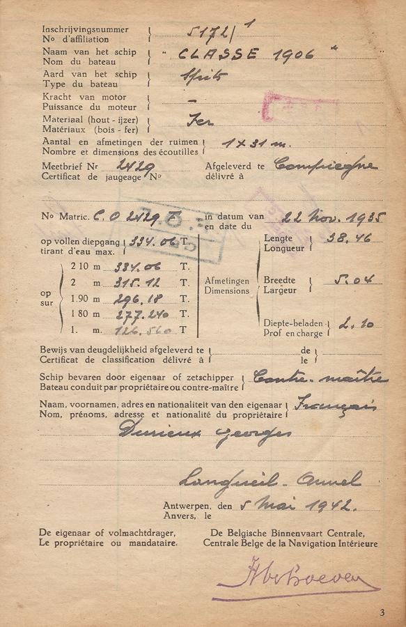 appartenant au spits CLASSE 1906, bateau en fer de 38,46m x 5,04m , pouvant porter 277,240 tonnes au mètre 80 et 334,06 tonnes à 2,10m, appartenant à Georges Durieux de Longueil-Annel et immatriculé CO2429F (matricule de Compiègne en date du 22 novembre 1935) :