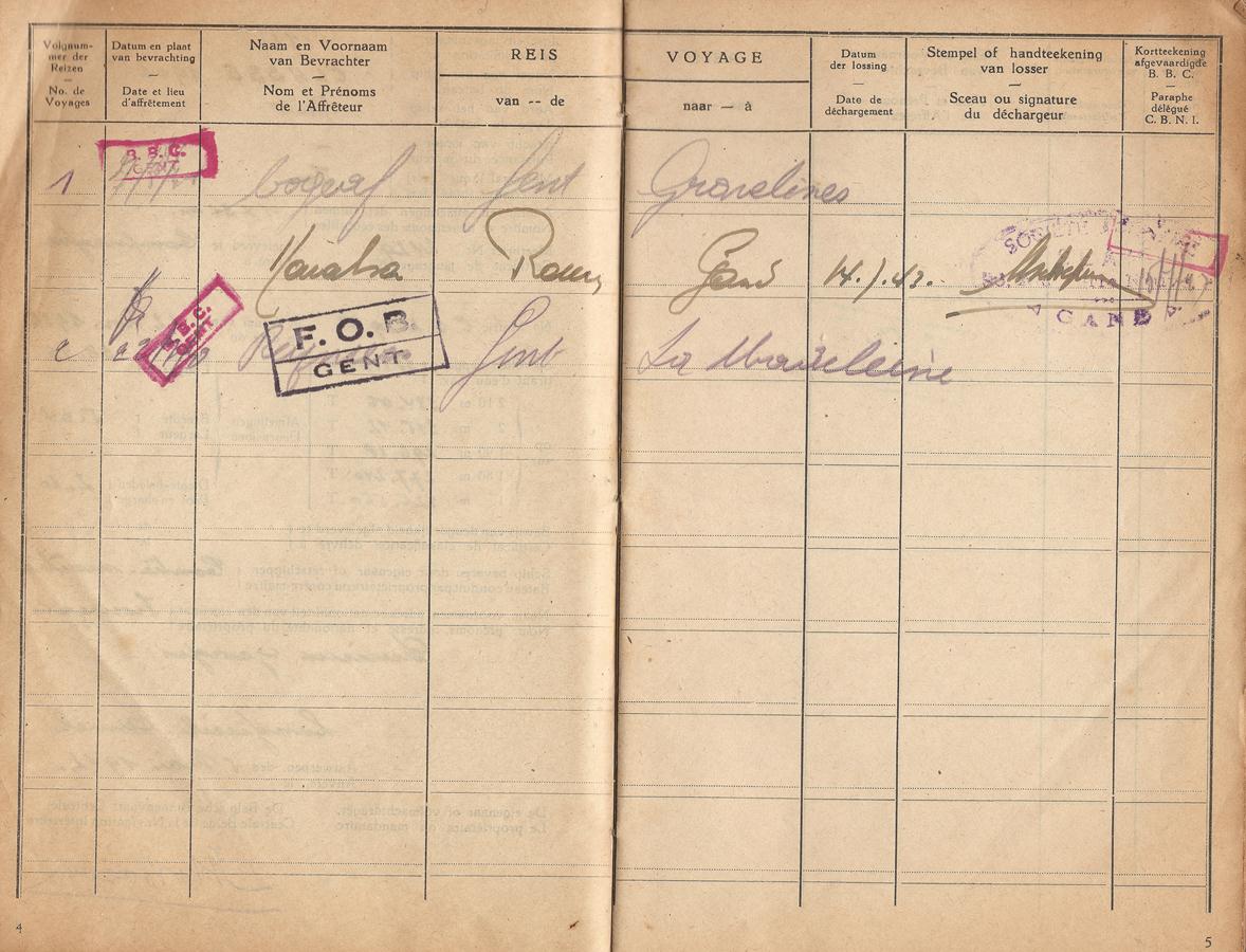 Pas énorme, trois lignes, alors qu'il y a neuf pages comme celles-ci dans le carnet. Pas évident à déchiffrer... Pour le premier voyage, un Gent - Gravelines en 1941. Le deuxième, un ??? (Rouen?) - Gand en 1943. Et le troisième, Gent - La Madeleine, en 1949. Enfin... si je lis bien !