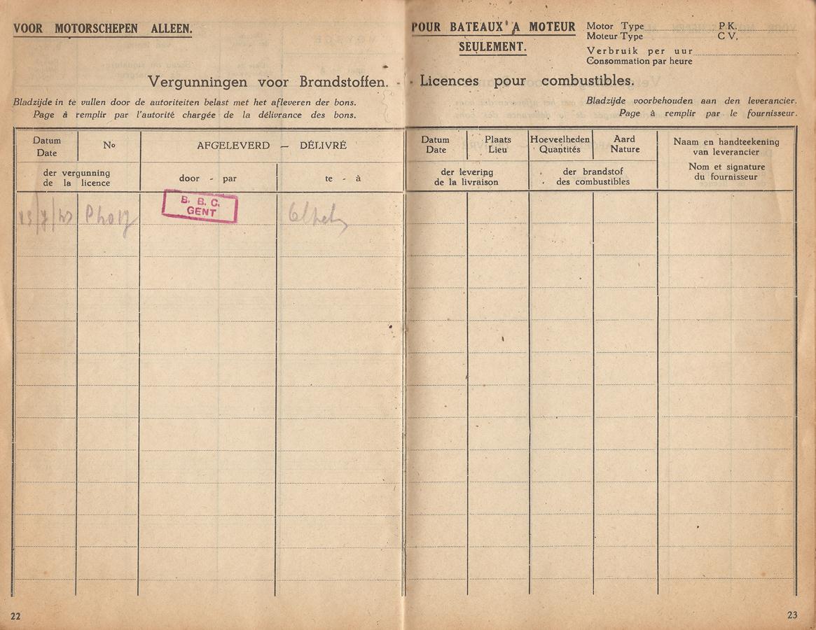 Une page que je comprends moins : réservée aux bateaux à moteur, elle concerne les licences pour combustibles... Il y en a au total 5 pages dans le carnet.