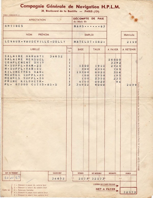 Bonjour, mes parents se sont mariés en 1962. Le premier bateau sur lequel ils ont embarqués ensemble c'était l'Antibes à l' hplm. Voici le salaire de ma mère : matelot ordinaire.