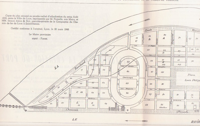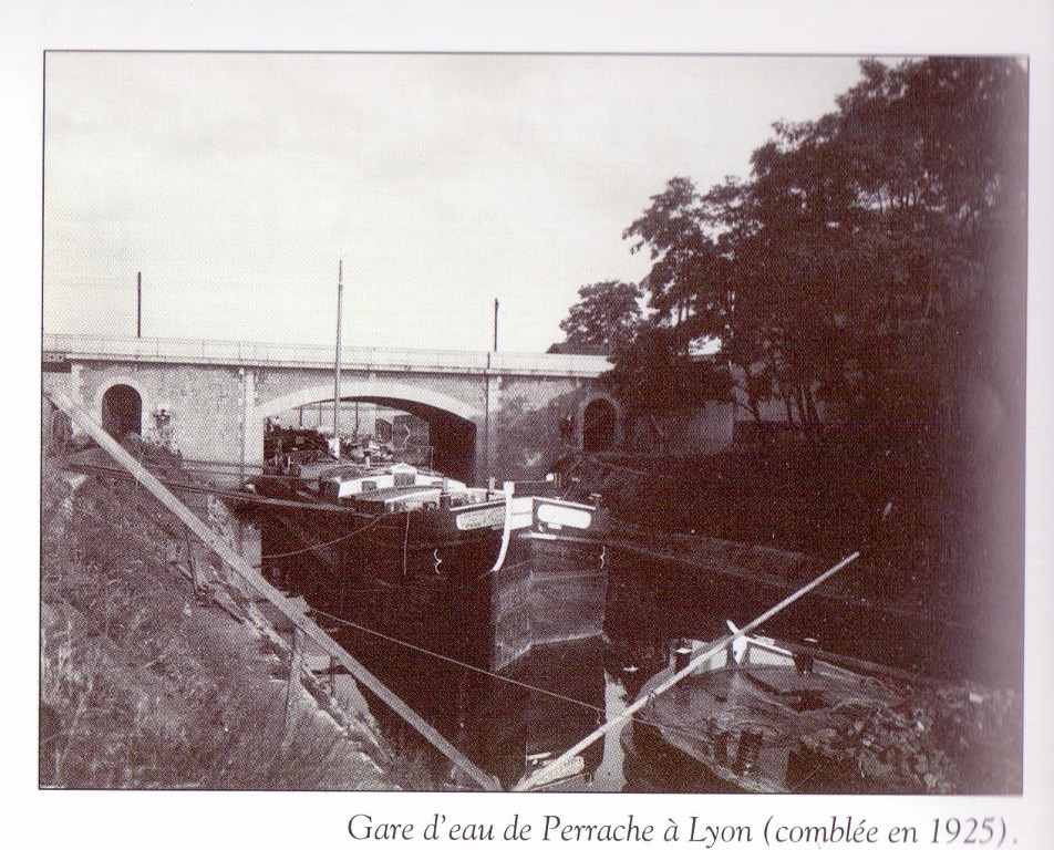 Les frères Seguin associés au physicien Biot obtirent de la ville de lyon la concession autorisée par ordonnance royale du 13 juin 1827 dans la presqu'île de Perrache, d'une gare d'eau devant assurer la liaison entre le chemin de fer d'une part, la saone, le rhone et les autres voies d'eau en liaison avec la saone d'autre part.
