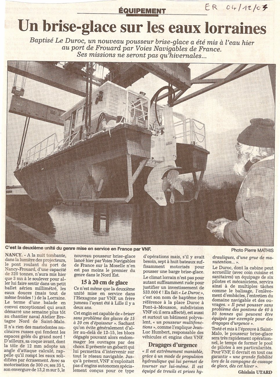 Mis à l'eau le 03 décembre 2004 au port de Frouard, en provenance (routière) du chantier Atelier de Bretagne Nord de Saint-Malo :