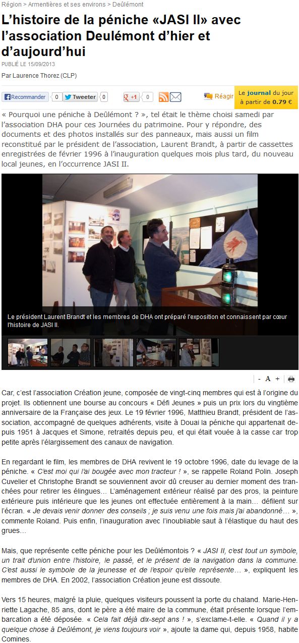 Article du journal La Voix du Nord consacré à l'expo organisée à Deûlémont au sujet du JASI II, dans le cadre des Journées du Patrimoine :