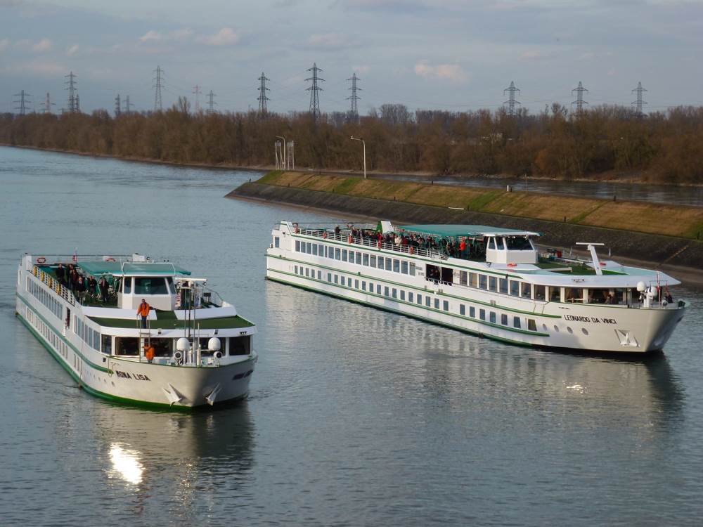 En effet, le MONA LISA (à gauche) "double" le LEONARDO DA VINCI (à droite), deux bateaux à passagers de CroisiEurope, ce dernier attendant que l'écluse soit prête : le grand sas est déjà occupé par le BEETHOVEN, un autre bateau de CoisiEurope, et un commerce, tous deux montants, tandis que le petit sas, dans lequel va entrer le MONA LISA, accueille déjà le VICTOR HUGO (un autre CroisiEurope !)...