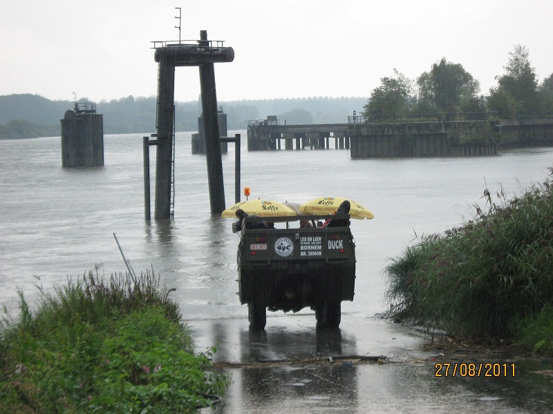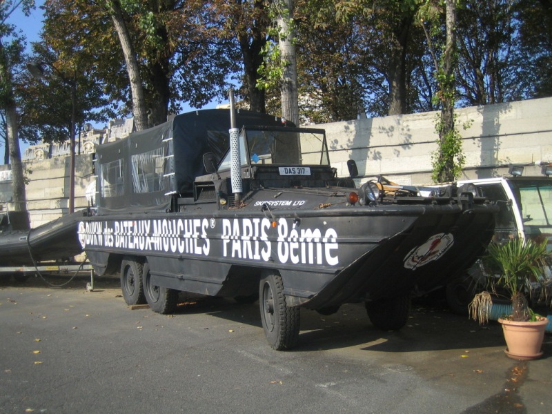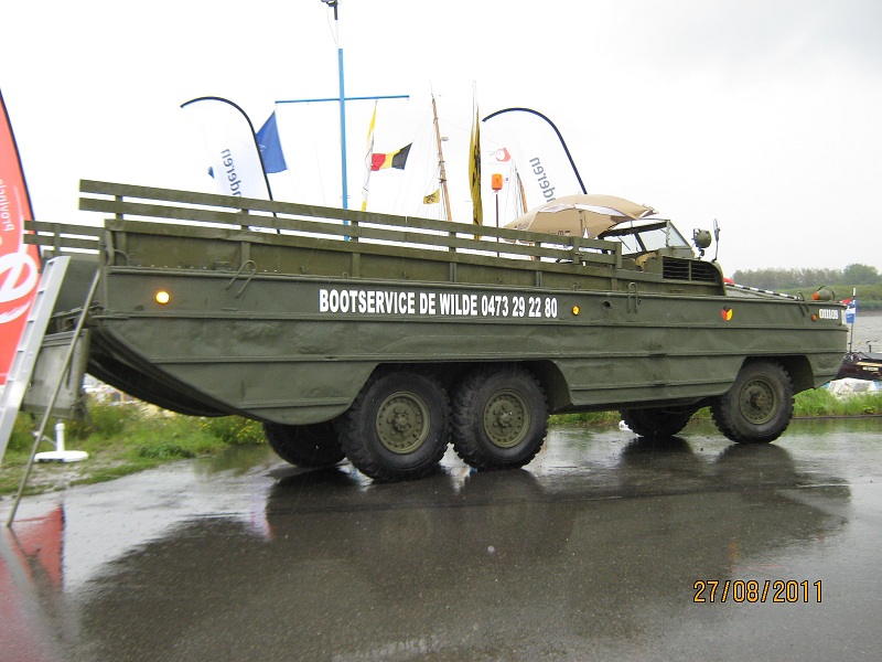 Ce véhicule amphibie est le DUKW 353 (Dual Utility Kargo Waterborne) surnommé "duck". Il a été construit à plus de 20.000 exemplaires depuis 1942. Moteur: GMC 270 , 6 cylindres ,4,417 cc, 104 cv ; Vitesse maximale sur eau de 10 km/h et d'une autonomie de 80 km. sur l'eau avec comme consommation 180l./100 km