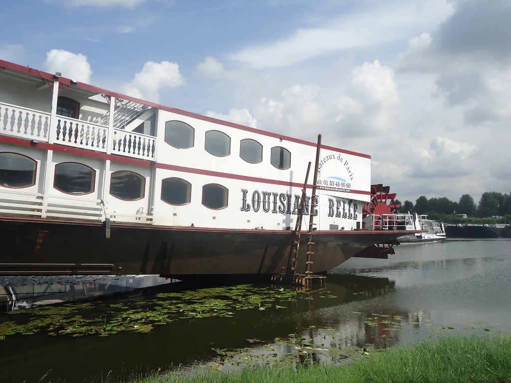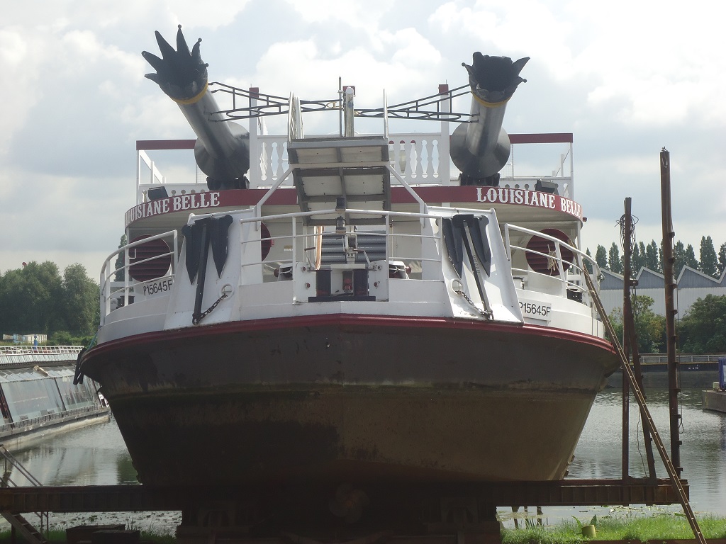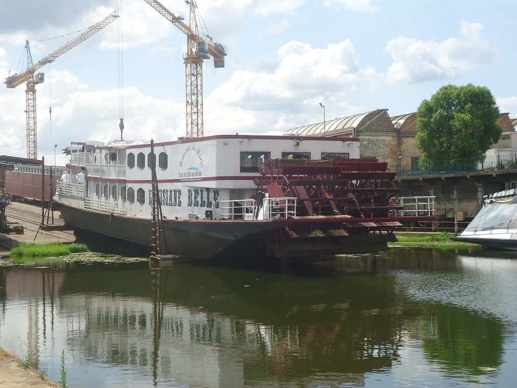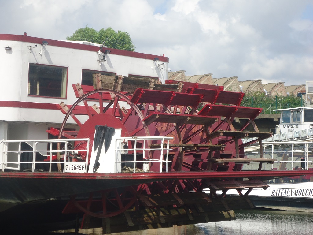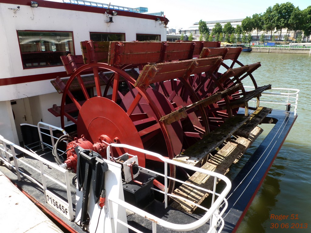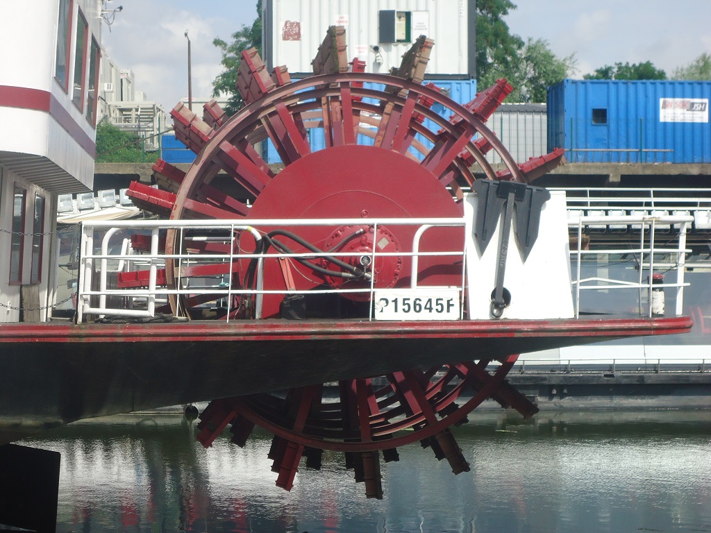 Les roues à aubes sont d`un type nostalgique ... avec des aubes à bois qui ne sont pas d`un type mobile pour laisser immerger les aubes dans l`eau d`une facon verticale. Bien sûr, ca marche, comme bateau passenger l`enfoncement du bateau n`est pas si grave. D`autre part, on pourrait s`imaginer que la propulsion du bateau n`est pas seulement achevée par les roues à aubes mais aussi par l`hélice avant le gouvernail.