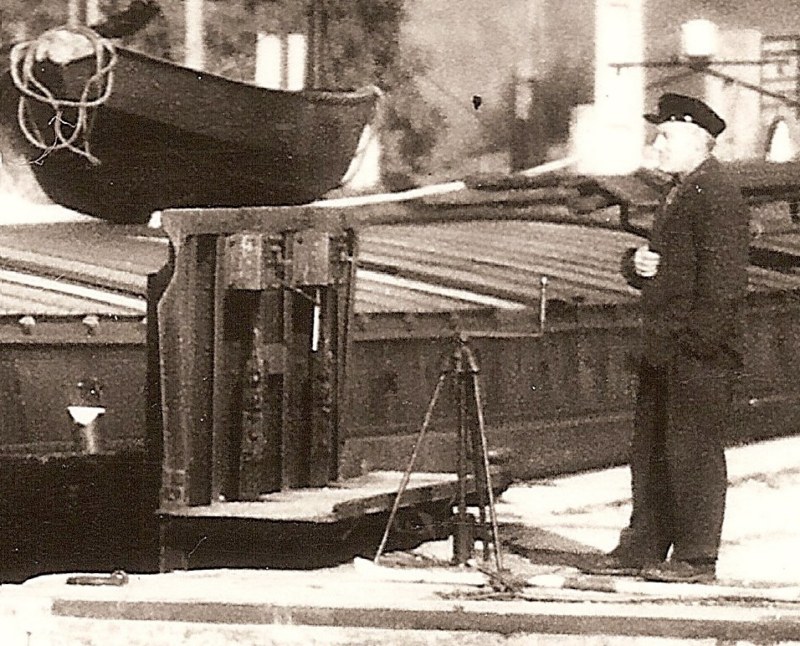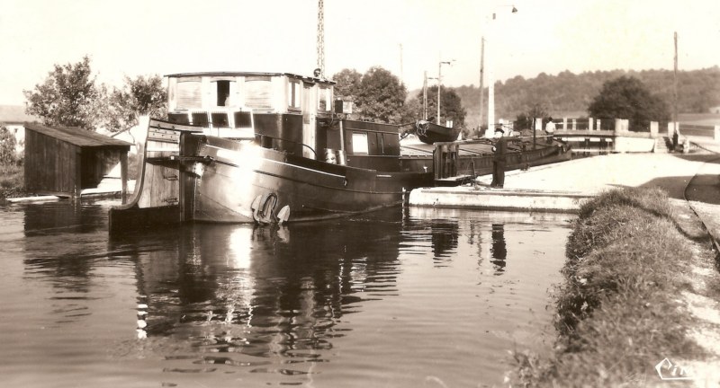 - l'éclusier, devant sa porte, avec sa casquette, peut-être la casquette de fonction de l'Office National de la Navigation :