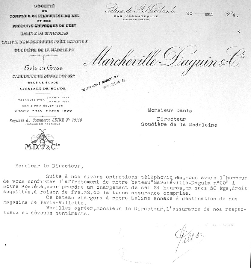 Ernest Daguin s’installe dans la région de Nancy en 1855, où il entreprend la construction de la saline de Saint-Nicolas - Varangéville, aujourd'hui "Salins du Midi", qui a chargé des bateaux jusqu'en 1998. Dans la foulée, il acquière une petite soudière et une saline à Laneuveville-devant-Nancy, au lieu dit Saint-Phlin, La Madeleine. La société Marcheville-Daguin est née, ainsi que sa flotte.