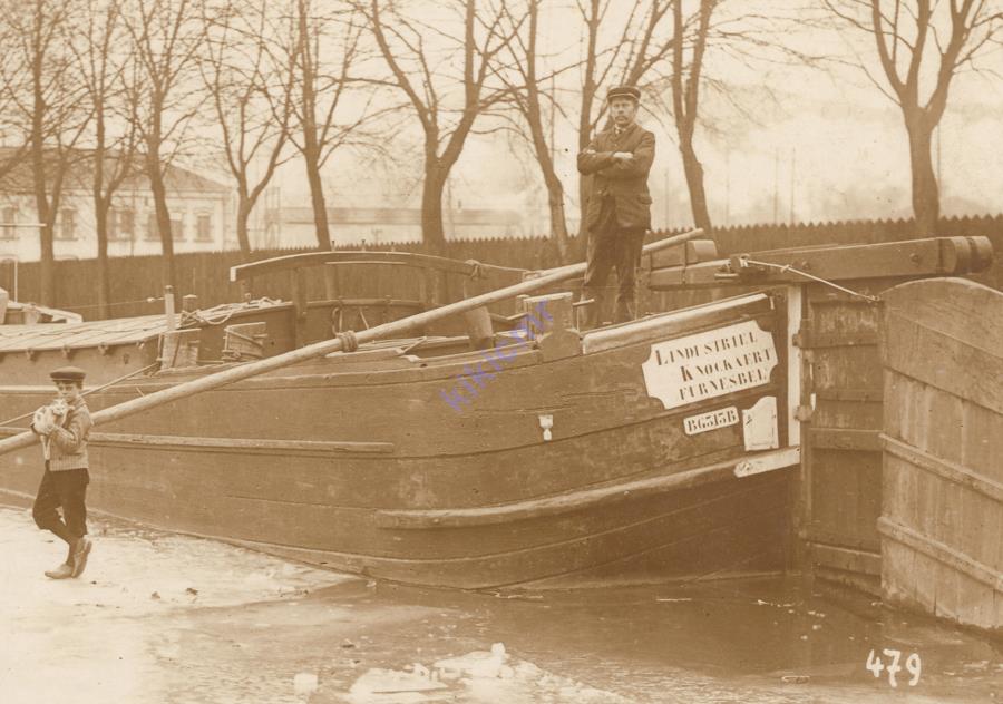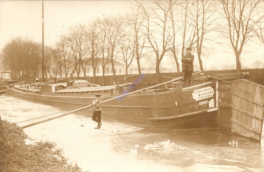 Au dos, une inscription indique que l'homme visible à l'arrière du bateau est Ernest Knockaert, le propriétaire de la péniche, et que la photo a été prise durant l'hiver 1913-1914. Malheureusement, pas d'indication sur l'endroit.