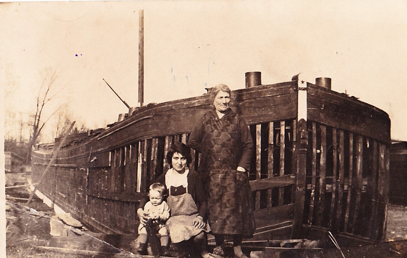 Voici le "Scarpe" la péniche où est né mon papa ici au chantier Deturcq à Beuvry en 1933 sur la photo on y voit mon arrière grand-mère, ma grand mère et ma tante qui a aujourd'hui plus de 80 ans. Je ne plonge pas dans la généalogie mais quand on sait que j'ai moi-même des petits-enfants on en arrive à la 6ème génération de bateliers même si mes petits enfants ne sont pas encore mariniers (peut être le deviendront-ils un jour) mais ils ont leur parents qui le sont donc ils connaissent très bien le bateau et vivent dessus toutes leurs vacances et les week-end (eh ! oui malheureusement ils connaissent aussi les joies de la pension). Quelle évolution (et heureusement) entre les jolies péniches en bois et la modernité des bateaux à l'heure actuelle. Malheureusement la société qui ne connait pas notre monde en sont restés pour la plupart à l'homme du Picardie et même certains pensent que le métier n'existe même plus ! (entre nous soit dit je pense que c'est ceux là qui n'ont pas évolués)