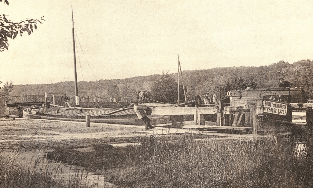 C'est ce que les collectionneurs appellent une carte postale animée : à gauche, deux femmes devant une cabane regardent le bateau qui vient d'entrer dans le sas, hâlé par les deux chevaux qui sont au niveau du pont, en rive droite. Le marinier, à l'avant du bateau, amarre ou tirage en main, regarde le photographe, de même que sa femme, qui vient de replier le gouvernail, et son enfant, habillé d'un gros pull et d'un cache-nez. L'éclusier, coiffé de sa casquette de service, ferme sa lourde porte amont à balancier, sur laquelle la qualité de la photo laisse admirer la ferronnerie du cric de crémaillère à manivelle...