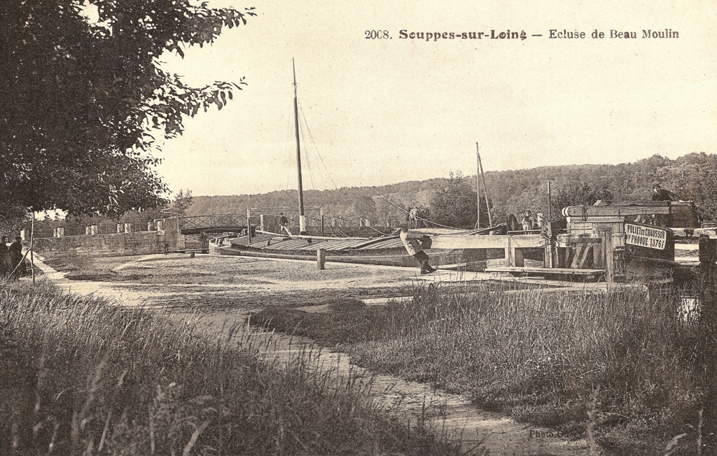 C'est ce que les collectionneurs appellent une carte postale animée : à gauche, deux femmes devant une cabane regardent le bateau qui vient d'entrer dans le sas, hâlé par les deux chevaux qui sont au niveau du pont, en rive droite. Le marinier, à l'avant du bateau, amarre ou tirage en main, regarde le photographe, de même que sa femme, qui vient de replier le gouvernail, et son enfant, habillé d'un gros pull et d'un cache-nez. L'éclusier, coiffé de sa casquette de service, ferme sa lourde porte amont à balancier, sur laquelle la qualité de la photo laisse admirer la ferronnerie du cric de crémaillère à manivelle...