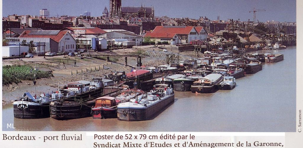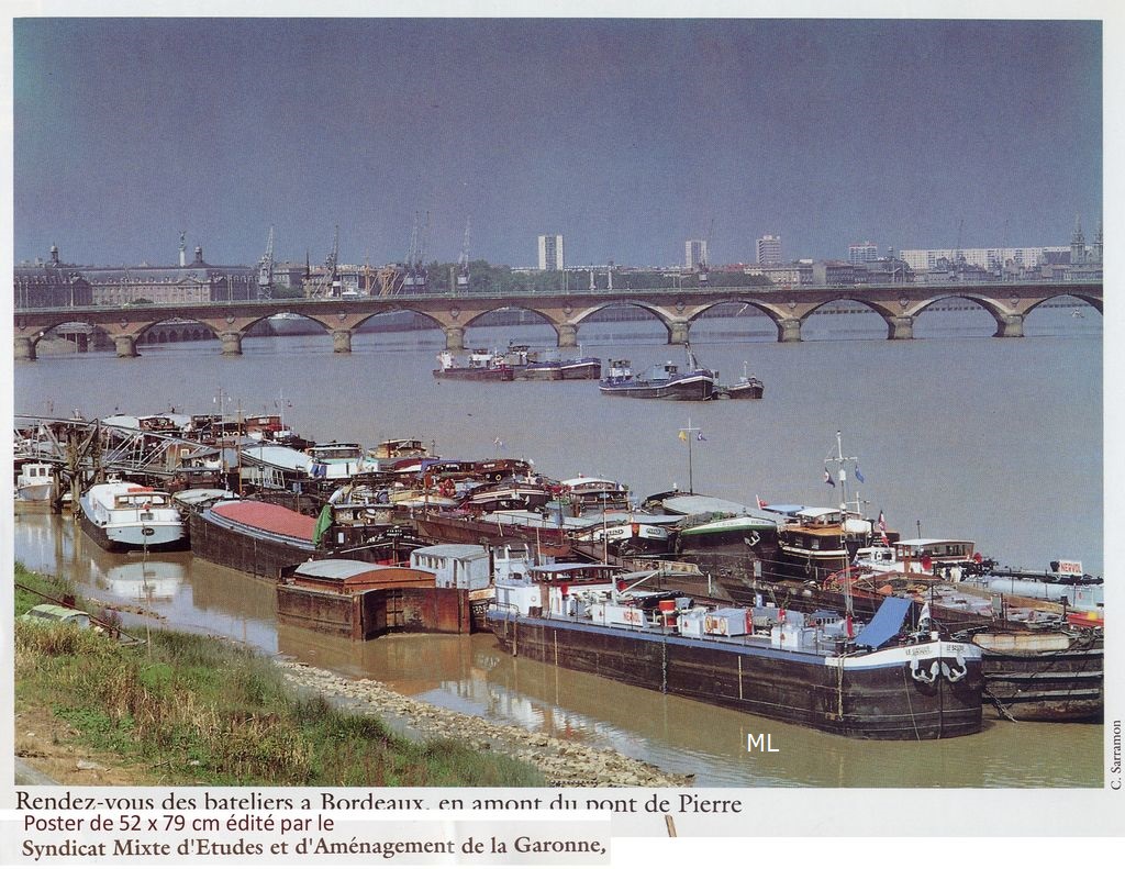 Je pense que c'est du ponton que tu veux parler , celui derrière lui est le même , je ne pense pas qu'ils aient eu des devises (surement des numéros) , il y en avait tout un tas de pontons de ce modèle qui étaient au port autonome ( genre porte vase , avec cale coffrée en trémie ), il nous en ont mis quelques un au ponton quai Ste Croix , mais il y en avait un peu partout , certains ont été poussés pour le gravier aussi , il en reste encore aujourd'hui , il y en a un au port autonome en aval du chantier quai de Bacalan qui sert pour la "Maqueline",il y en a un juste en face quai de Brazza peint en bleu chez chantiers CNB pour accoster leurs voiliers.Part contre il y en a eu 1 seul de ce modèle qui a été transformé en Automoteur : le " Champlain" avec 2 DK6 , j'ai débuté dessus aussi quand j'étais au gravier, dimensions environ : 45m x 7m50 , la barge du "Dropt" était aussi un modèle comme ça.
