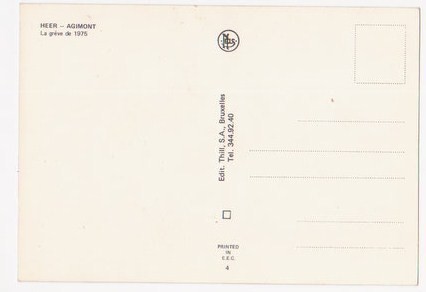 Et voici le verso de la carte des grèves à Heer-Agimont. Je pense que les grèves de 1975, étaient à l'automne et celles de 1973 en mai-juin. Donc plus de doute sur la date de la carte postale de Sylda. Baron avait aussi cette carte dans ses archives persos.