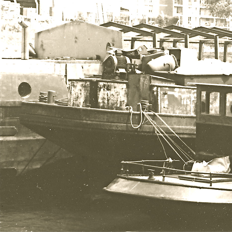- au premier plan un "beurtschip" en transformation ( actuelement à Neuilly je crois )